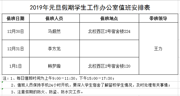 » 2019年元旦假期学生工作办公室值班安排