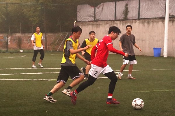 参赛队员们个个精神饱满,蓄势待发。本次足球赛共九支队伍,并将其分为三组。根据比赛安排,小组赛共有9场比赛,每场比赛都十分激烈。队员们经过一番热身过后,随着哨音响起,比赛正式开始。球员们在绿茵场上奋力奔跑,他们与对手对抗的时都无所畏惧,在足球场上奋力守住每一寸属于自己的土地。上午的比赛打得十分火热,双方的攻势此起彼伏。随着裁判一声哨响,上半场比赛正式开始。刚开始不久,在队员们昂扬的斗志与高超的技术下,赛场上形势越来越胶着,不时发起高潮,场边的观众也渐渐多了起来,大家连连欢呼叫好,紧张而又激烈的气氛一直环绕着球场。比赛进行了二十分钟后,进行中场休息,双方队员都大汗淋漓。即使在这短短的十几分钟的休息时间,各队队长仍不放松,还在进行赛前战术安排和人员调整问题。休息结束,比赛继续,双方又进行了后半场的激烈酣战。球员们就像在草原上的一匹脱缰的野马,尽情地享受着这场比赛。