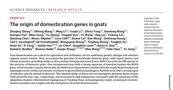 5月20日,Science旗下著名期刊ScienceAdvances《科学进展》以封面论文报道了我校动科学院姜雨教授团队有关“山羊驯化基因的起源””的文章,阐明了现代山羊广谱适应能力强源于通过杂交获得其他物种的MUC6基因, 该基因与其他驯化基因一起,帮助山羊成为最早被成功驯化并广泛传播的家畜。同日,《科学》杂志正刊以“Ancient hanky panky gave modern goats their iron stomachs”为题,对该发现进行了采访和报道。