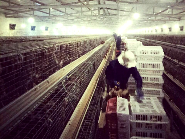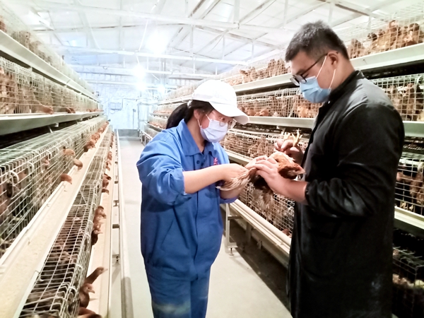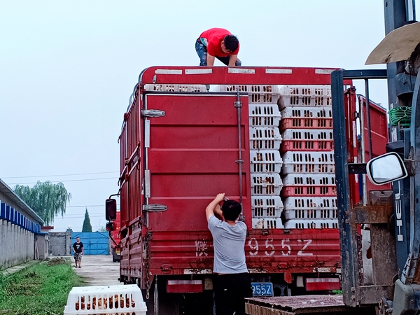 蛋鸡在15周龄时生殖系统开始发育,因此,青年鸡转群工作应在15周龄前进行,该公司通常将蛋鸡饲养至8周龄出售。8月15-16日,正值该公司8周龄蛋鸡售卖转出之时,为减少应激,选择清晨或下午至晚上进行。在王场长的指导下,三位同学和一线员工一起完成了三栋鸡舍的装鸡及运输工作。