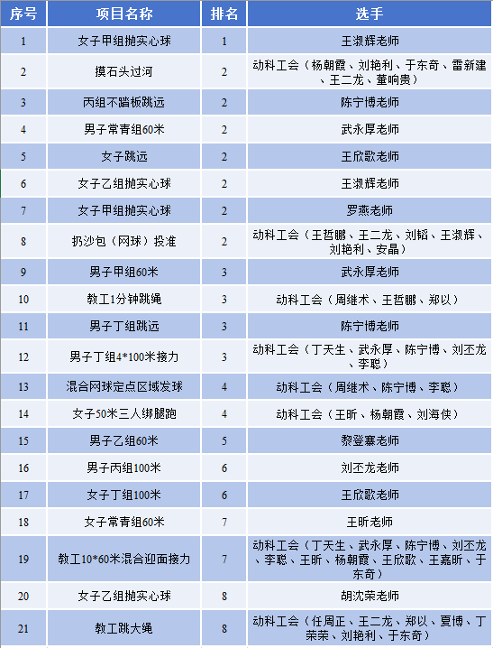 比赛场上,平日深耕教学科研一线的老师们化身运动健将,在赛场上挥洒汗水、挑战自我!田赛场上,王淑辉老师在抛实心球项目中以11.15米的成绩刷新个人记录;陈宁博老师在跳远赛道上凌空一跃,赢得满堂喝彩。径赛角逐,武永厚老师上场即稳坐男子常青组和甲组60米的前三甲;男教工4*100米接力赛中,学院代表队配合默契,不断超越,用速度与激情荣获第三名。趣味项目“摸石头过河”“扔沙包投准”“绑腿跑”“1分钟跳绳”“网球定点区域发球”“跳大绳”“10*60米接力跑”等集体项目中,教职工们凝心聚力,诞生一个又一个“梦之队”,用行动诠释“团结就是力量”!