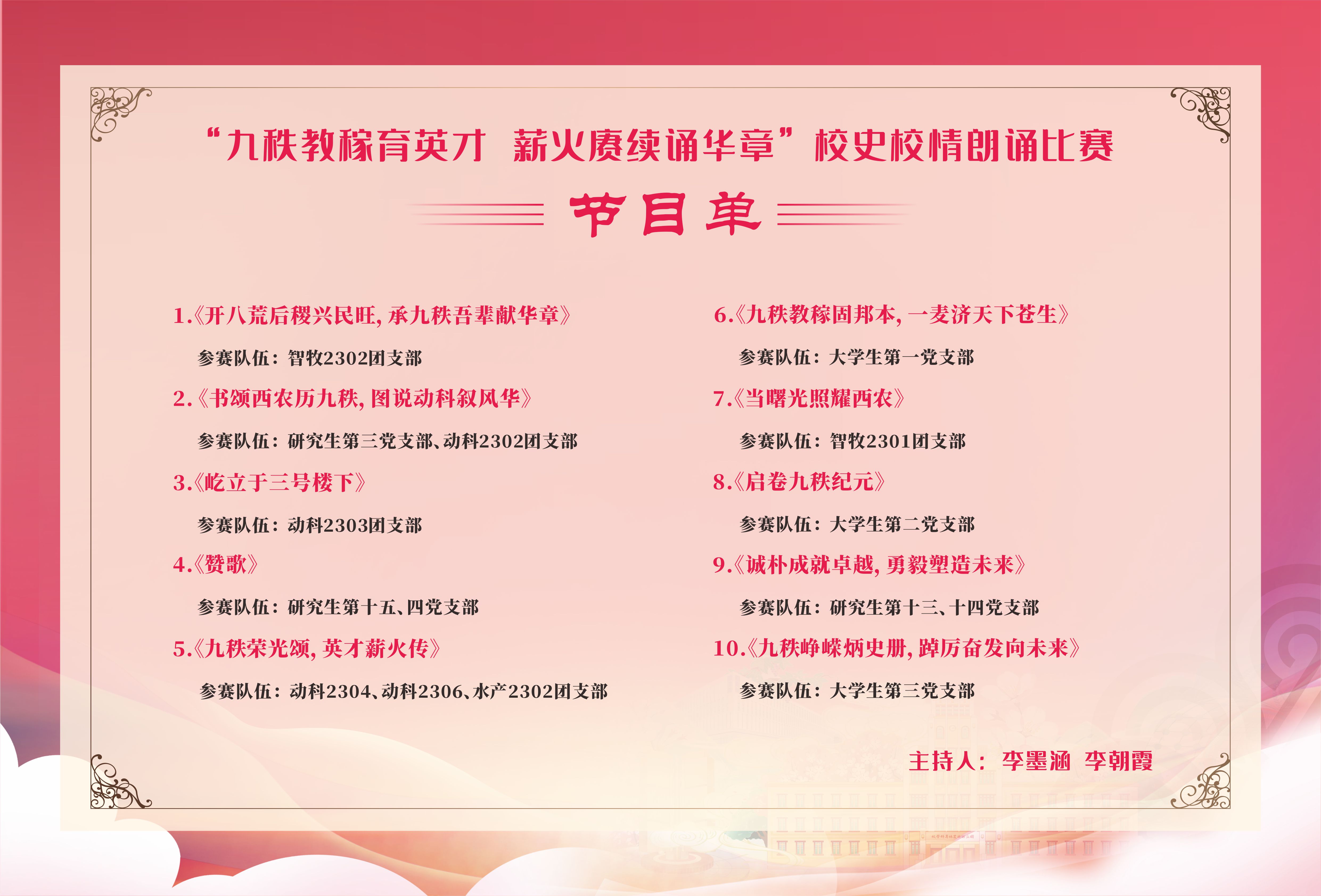 九十载风雨兼程铸就辉煌,新时代赓续奋进再谱华章。为迎接建校90周年,传承和弘扬西农精神,发挥以史育人、以文化人的积极作用,以校史文化助力师生成长,发挥高校文化独特的精神陶冶作用,经过一个多月的精心筹备,由av在线 党委主办,学院团委承办的“九秩教稼育英才 薪火赓续诵华章”校史校情朗诵比赛将于5月24日晚7:30在北绣山活动中心大厅隆重上演。