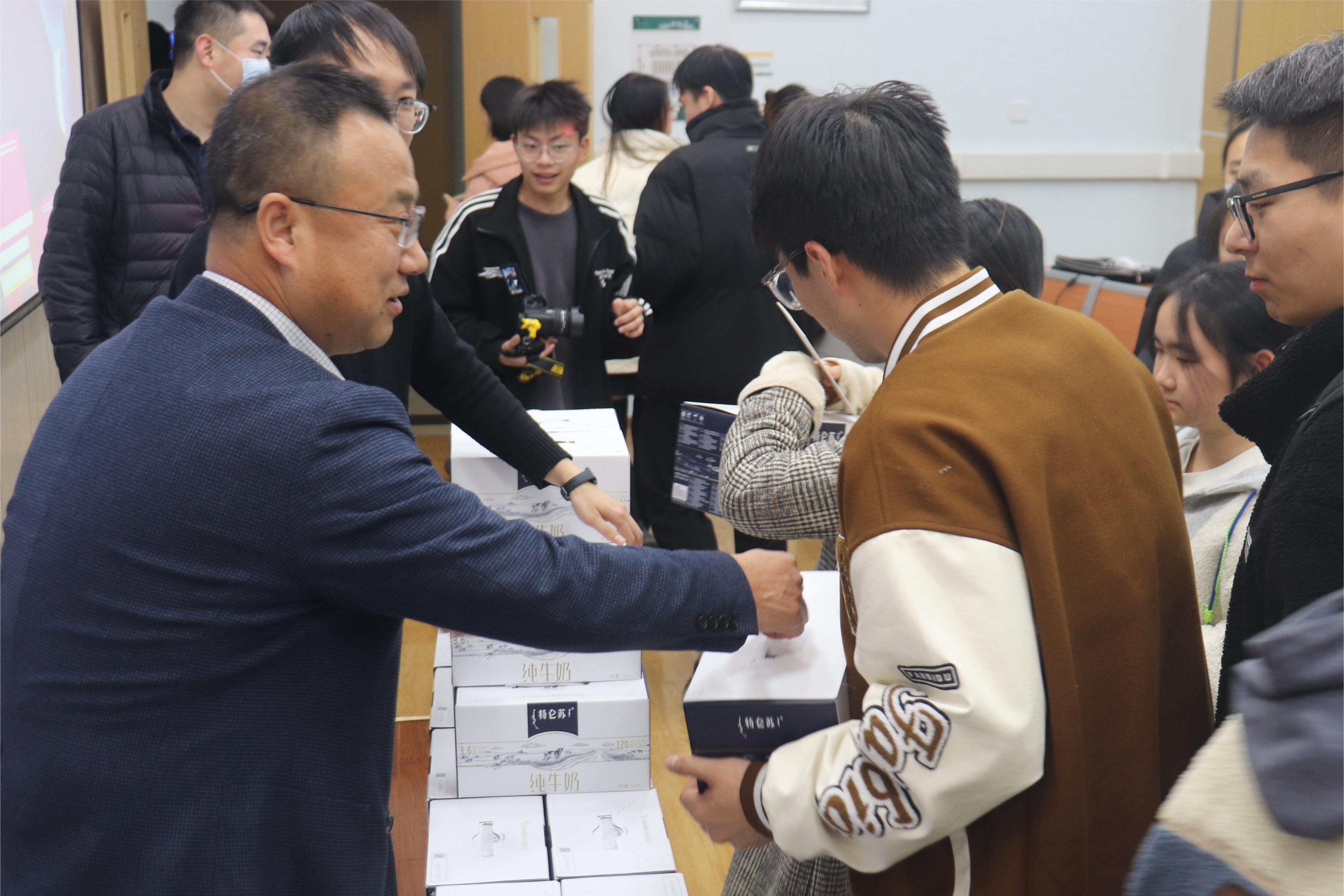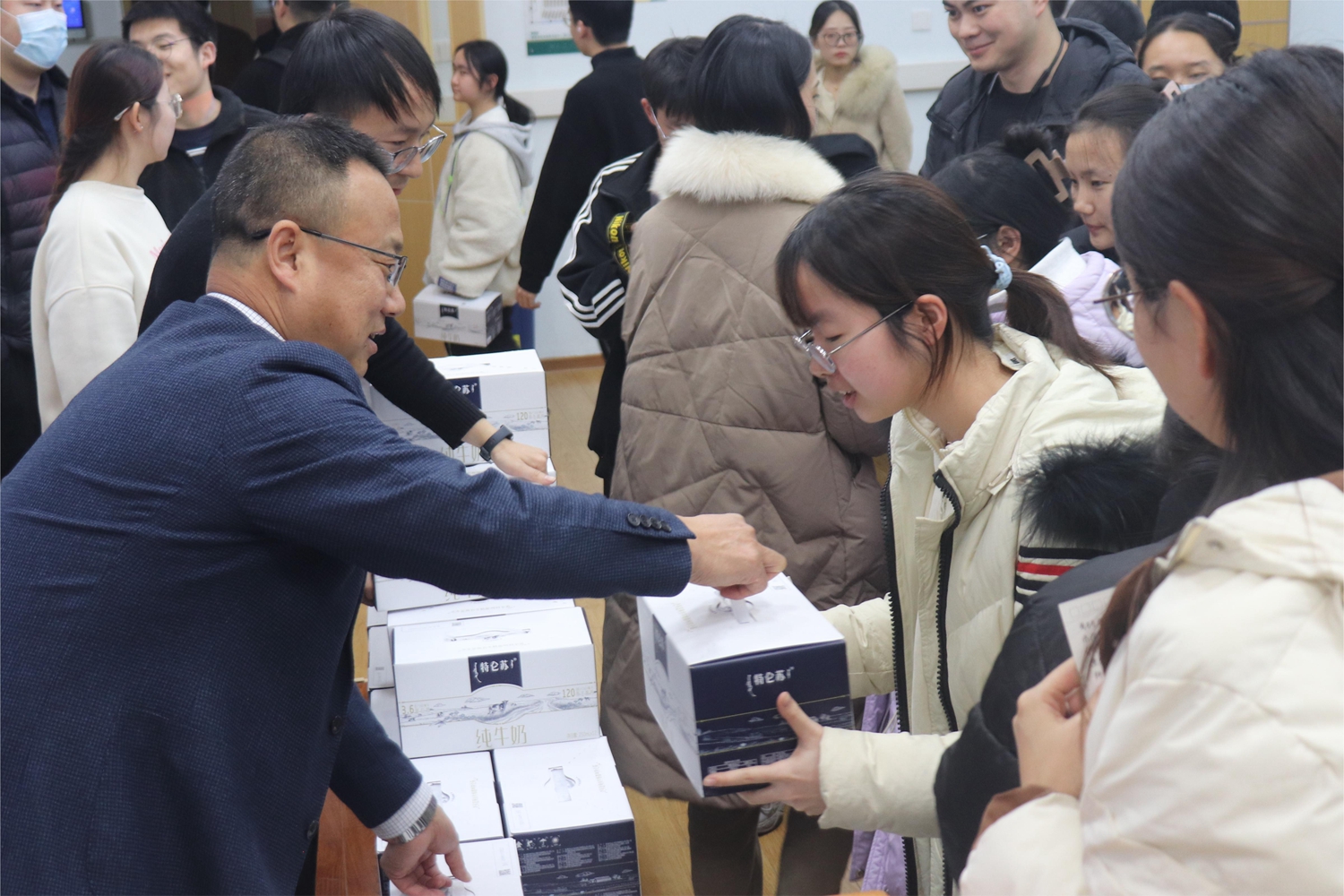 随后,王力为同学们分发学院准备的特仑苏牛奶和低年级学生准备的祝福卡片,给同学们补营养、送温暖。