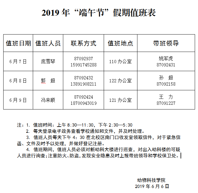 » 2019年“端午节”假期值班表