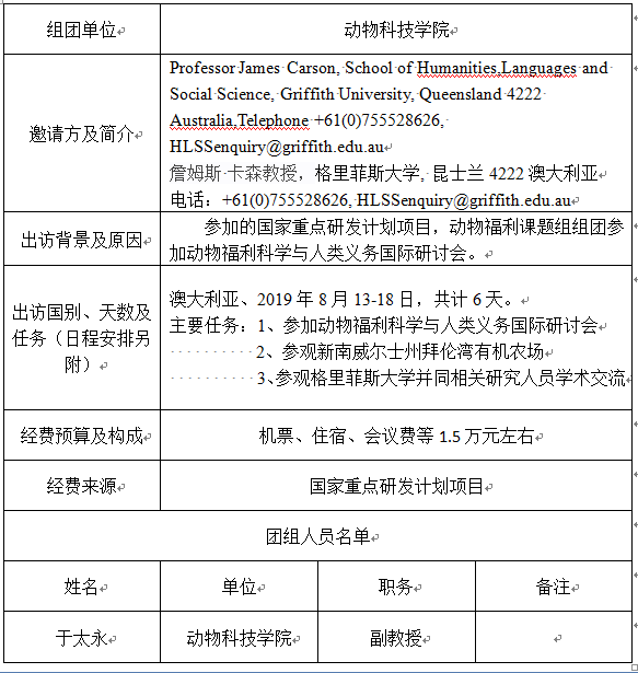 现将于太永副教授因公出国予以公示,公示期自2019年7月3日至2019年7月7日。如有举报意见,请以书面或口头形式向学院党政综合室反映,电话87092937。(公示内容见下表)