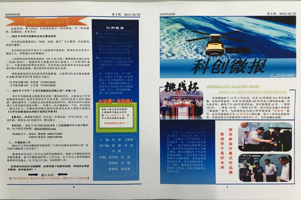 本次《科创微报》以服务广大师生为宗旨,以实用、亲民为特色,以培养学生科技创新意识和实践操作能力,提高学生科研潜力和学术水平为目的,于11月1日至3日三天内完成各项打印及分发工作。本期微报内容共设有陕西省第十届“挑战杯”总体介绍、av在线在“挑战杯”中获奖作品介绍、科创大牛、通知栏、你问我答及欢迎投稿六个栏目。与第一期科创微报相比,第二期特增设“通知栏”与“你问我答”两个专栏,宣传近期科技创新赛事,并且广开言路,进一步收集学生意见,了解学生需求,就同学们关注的问题进行答疑解惑,从而搭建老师、科创达人与学生之间的有效沟通平台。