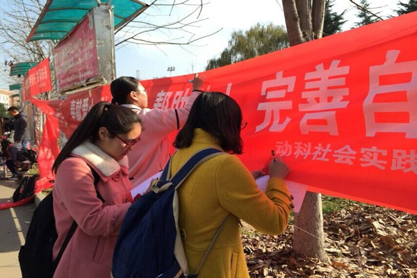 活动当日,av在线实践部成员在西雕集合张贴题为“奉献爱心,弘扬新风,帮助他人,完善自我”的横幅,向过往师生介绍宣传志愿服务精神,并邀请同学们在横幅上签名留影,共同为志愿精神的推广做出努力,该活动引发了过往同学的强烈兴趣,大家停下步伐,积极配合,在横幅上签下自己的名字,表明自己积极弘扬志愿精神的决心,活动进行地十分顺利。同时,工作人员也向同学们发放了介绍志愿精神的宣传单,以此鼓励大家关注了解志愿精神,并身体力行地加入到志愿者的队伍中去。