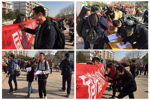 活动前期,志愿者们向学院14及15级同学发放调查问卷,了解当今大学生的法律意识及知法程度,并以此为依据制作法制宣传页,为后期法制宣传相关活动做好铺垫。“一二·四法制宣传日”当日,志愿者们分发宣传单,并邀请过往同学在写有口号“共谱法制宣传曲,共唱和谐校园歌”的横幅上签名,呼吁大家提高法律意识、加强法制观念。极具号召力的宣传语以及志愿者们详尽地介绍吸引全校各院各级过往同学驻足,大家积极了解参与到活动中来,在横幅上签下自己的名字,表明自己将积极支持普法活动,努力参与建设法制校园的决心。活动现场气氛热烈,同学们纷纷表现出对构建法制校园维护自身权益的渴望。动科152班韩萌萌同学表示:自己将在今后的学习生活中坚定自己的立场、敦促自己的言行,为法治校园奉献自己的一份力。