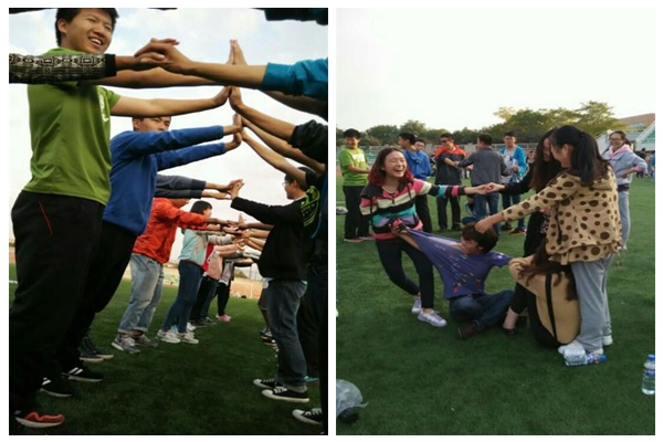 不同于团组织生活以学习精神为宗旨,本次联谊活动更倾向于以交流实践为目的。一支舞蹈,一曲音乐,同学间的陌生与距离在欢声笑语间被打破,而紧张有趣的“松鼠 大树 地震”游戏,更是打破了不同年级同学之间的拘谨与约束,同学们手拉手,搭起一座”爱”的桥梁,在游戏中增进友谊。除了节目与游戏,两个年级的学生还围坐在一起相互交流,沟通彼此的大学生活。实践证明,欢笑和坦诚是打破陌生的有力“武器”,短短一下午的时间大家已经打成一片,整个操场充斥着同学们年轻爽朗的笑声。