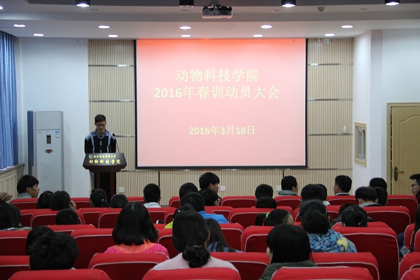 为积极备战校运动会,号召鼓励更多同学“走下网络、走出宿舍、走向操场”,3月18日,av在线于动科楼107会议室举行2016年春训动员大会。av在线体育辅导员任启俊、王斌,团工委书记李锐,辅导员张士军,100余名春训队员参加了此次大会。