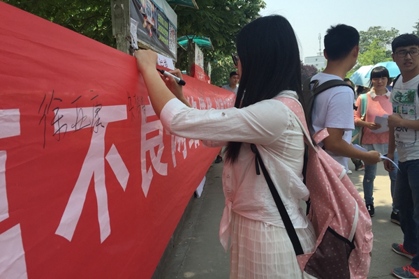 在宣传横幅上签名