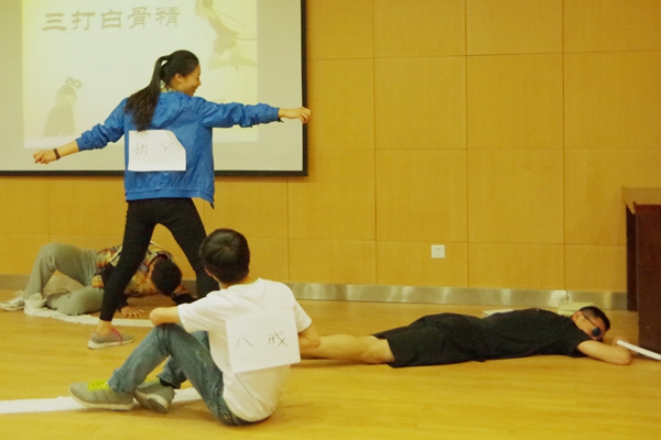 话剧队同学在av在线英语话剧大赛中表演《新编三打白骨精》