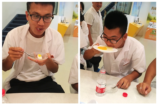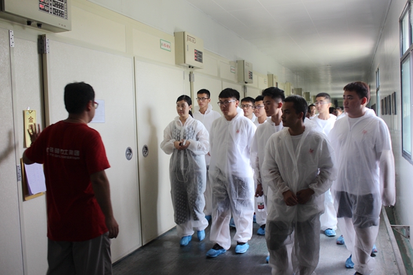 同学们亲身体验,身着消毒服与消毒鞋套,前往企业一线,分别参观了铁骑力士集团牧业科技原种场、禽业公司孵化场与圣迪乐村养殖厂,在解说员的讲解下了解了种猪场、孵化场以及圣迪乐村蛋鸡生产的运行流程。参观期间,同学们通过观影、座谈、品尝等方式,与各产业链的负责人积极沟通并针对不了解的地方进行询问。同时,企业为了让同学们更加深刻地了解集团的发展现状与前景,各养殖基地为同学们展示了基地的标准化流程、先进的设备以及全自动化生产链等。其中,圣迪乐村蛋鸡养殖基地负责人为同学们准备了自己生产加工的鸡蛋,并展示了该种鸡蛋独有的特性,让同学们在试吃品尝中感受到了铁骑力士集团的热情招待以及农牧行业未来广阔的发展前景。通过走进生产一线,与生产实践面对面,与生产师傅深入交流,队员们对生产一线运行流程有了深刻的了解,先进的生产设备、一流的养殖技术、干净的饲养环境,使队员们对传统农牧行业的印象发生翻天覆地的转变。