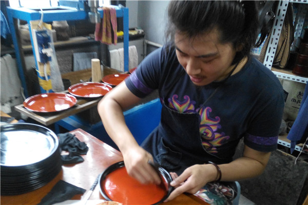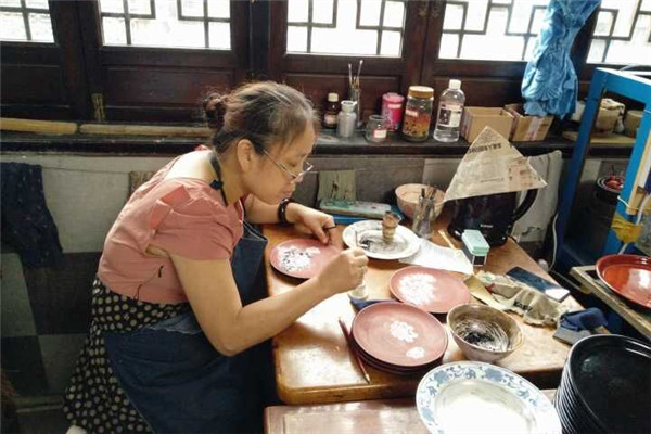 深入感受漆艺魅力。在漆器制作间,队员们有幸亲眼目睹了漆艺制作的全过程,手工艺人们悉心制作漆器,用心进行钩花和刷漆等操作,全身心去勾勒每一个细节,只见他们用刀如笔,在胎底上雕刻各种花纹,填以色漆,反复打磨抛光,完成“雕花填彩”的工艺。漆器成品精美异常,动人心弦,其上绘有精心描绘的禽、兽、神仙等图案,造型美观大方、工艺精巧,漆面透明如水,光亮如镜,视觉效果神奇异常。队员们通过近距离接触漆器,深刻感受到了漆艺文化的魅力,内心受到了极大触动。