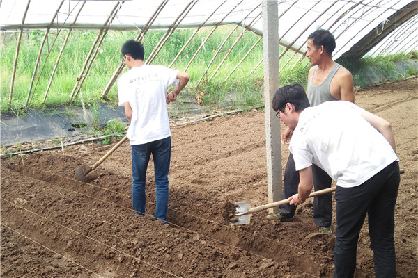 古交市关头村是著名的红色老区,这里的农业体验基地也集中体现了红色老区在农业现代化发展上的情况。村里的农业基地是农业部蔬菜标准园,面积270亩,年产无公害蔬菜3400吨,主要的种植品种有草莓、甜瓜、西红柿等。据工作人员介绍,大棚内采用水肥一体化技术,并使用了诱虫板、杀虫灯等现代化科技。这里采用穴盘育苗来种植作物,还会定期引进新品种进行培育种植。在工作人员的带领下,同学们进入了大棚,亲身体验了现代化的农业科技。虽然使用了很多现代化的技术,但是大棚内空间狭小,无法使用大型机械,所以大部分作物都是按原始方式进行种植的。队员们也在大棚内体验了除草、耕地这样的工作,虽然时间不长,但是也深深地体会到了农民伯伯的艰辛。