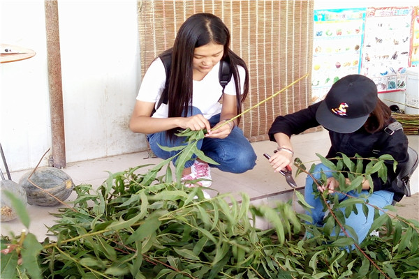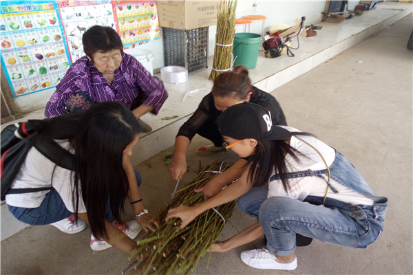 抵达目的地后,队长王慧与合作社负责人取得了相关联系,当下正是桃树嫁接的时节,于是在负责人的带领下,同学们帮助合作社其他工作人员一起加工桃枝。在工作人员的细心指导下,同学们很快便学会了修剪桃枝。工作人员还给同学们讲解了嫁接知识,因为桃树需要嫁接才能节桃,此时的嫁接工作繁重而重要。嫁接前需要将桃枝的多余枝叶剪除,留下芽胞,经过相关处理后,便可以将枝条嫁接到母树上,而一棵桃树上也可以结出不同品种的桃子。同学们很快就熟悉了手中的工作,默契而又欢乐地帮助合作社完成了修剪枝条的事务。工作完成后,负责人给同学们品尝了当下收获的桃子,同学们尝后赞不绝口。同学们一边享受桃子带来的清甜,一边与社里的人们一同谈论,感受培养桃树的种种奇妙。