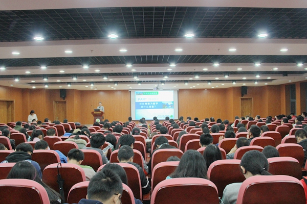 首先,杨增荣老师就本科毕业后的几种发展方向做了解读说明,保研,考研,就业,出国,无论哪条路,都能走出自己的精彩之路。他列举了优秀学长学姐们的成功案例,用真实的事例鼓励新生从大一开始打好基础,学好英语,将会受益终身。同时,杨老师还向同学们介绍了我校的一些出国政策,提醒大家早做规划,也衷心的希望同学们能充分利用学校丰富的资源与广阔的平台,放眼世界,增长见识。