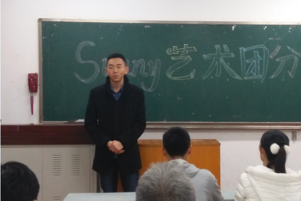 sunny艺术团团长徐天扬向大家介绍了艺术团下设各队伍的职能属性,结合自身经历分享了艺术带给人的熏陶与提升,勉励同学们在艺术团大家庭里发挥特长,有所收获。