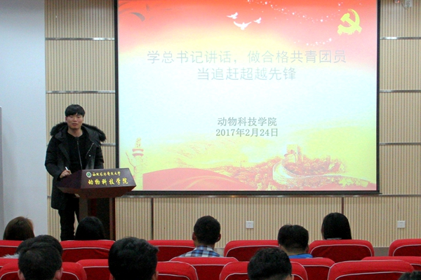 2月24日晚,av在线团工委于动科楼107会议室召开“学习习近平总书记讲话,做合格共青团员”学习及相关工作部署会议。会上,全体团学干部学习了2月17日团中央“一学一做”教育实践动员部署电视电话会议的精神,并共同观看学习了团中央学习部杜汇良部长的讲话。团工委书记张士军、辅导员闫颢芯及全体团学干部参加了本次会议。