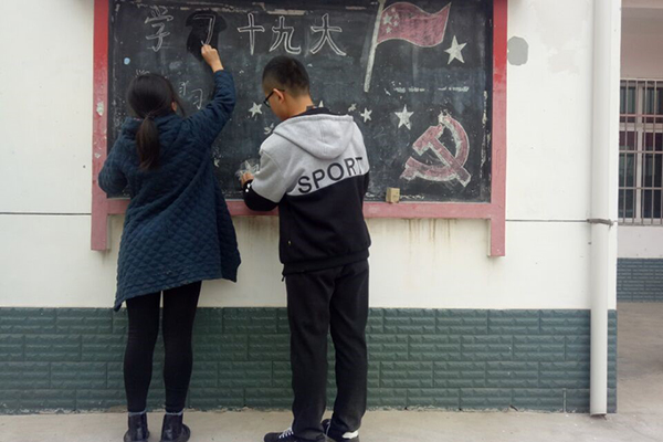 活动开始前队员们在与汤主任的沟通中了解到十九大精神的宣传是最近工作的重中之重,而黑板报则是最为有力的宣传方式之一。在队员们到达汤家村村委会之后,队员们和村委会成员一起讨论了黑板报的内容和板式问题。最后结合村干部意见和提供给队员们的资料,队员们开始了绘画工作。队员们首先将十九大报告中关键词和新提法工整地写在了黑板上,由此可以让村民在第一时间就了解到十九大的新思路,学习到十九大的新精神。黑板报上队员们还画上了党旗和党徽,小小的黑板因为有了鲜艳的党旗和党徽而显得愈发引人注目。并且还引来了旁边围观的小朋友的阵阵掌声。在队员们绘画完成后并请汤主任来验收时,更是得到了汤主任对队员们一丝不苟的工作精神和助力乡村精神文明宣传的志愿服务精神的表扬。汤主任还强调大学生要走出书本,多多关心国家大事,做到家事国事天下事,事事关心。队员们也表示作为田园使者理应为乡村发展做贡献,在得到村民和村干部的认可后,队员们也定会牢记初心,努力把田园使者做的更加出色。