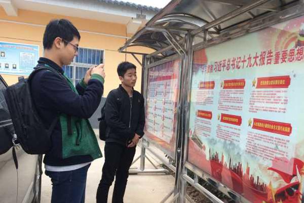 来到寨东村,村助们发现宣传板上内容都已是关于十九大相关政策及思想,不少村民聚在宣传板前,认真学习着十九大精神。通过与村主任的交谈,村助们了解到村中掀起了学习十九大精神的热潮,村中每周举办党内活动,党员集中学习并讨论十九大精神,为村民们起到了良好的模范带头作用。同时加强了十九大精神宣传力度,通过分发宣传页等各类活动向村民们普及相关知识。在认真阅读了宣传板内容后,村助王健宇向村民们讲述了此次十九大召开的重大意义,从五年历史性变革、中国主要矛盾的变化和习近平新时代中国特色社会主义思想内涵等内容,村民们不时提出疑问,村助们一一详细解答。一番热烈的讨论,让村民们切实学习到了十九大精神,深刻感受到了党的与时俱进。
