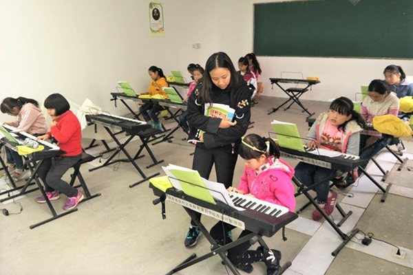 自10月14日起,支教团的志愿者总能通过各种方式来准备好单车,只为赴一场丁香花色的约定。从北门出发,西行三公里约二十分钟,途中有几个大长坡,也有几处狭窄的路。志愿者不辞劳苦,每周都如约而赴。在少年宫的教室里电子琴、架子鼓、乒乓球台、羽毛球拍等用具样样俱全,一张张孩子们的笑脸围着年轻的支教志愿者满是天真。少年宫负责人介绍道:“少年宫不缺教学器材,缺的就是一批专业的老师。”动科学院的支教志愿者,都是通过层层面试与选拔筛选出的文体方面特长的大一新生,他们自愿的来到这里,只为圆一份支教梦。志愿者们用细心耐心的态度,陪伴着少年宫的孩子度过了一个又一个有趣有意义的周日时光。少年宫负责人魏萍老师对此做出高度的评价,“老师们都非常好,孩子们都很喜欢你们的课,你们丰富了孩子们的课余生活!”