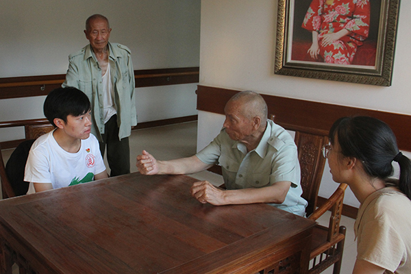 “你们是大学生吧!”正在队员们准备进屋时,身后突然传来了浑厚有力的声音。一位面容坚毅的老兵在身后叫住了队员们,并热情的拉着大家围坐在大厅中的桌子边,开始讲述他的故事。同京飞老人已年逾90,身着军装,腰板挺直,声音浑厚,口中吐出的是70年前那段烽火岁月……“日本人有飞机,打到最后我们全连只剩6个人,但是大家还是拼到了最后走一刻。”1942年,同京飞跟随部队奔赴山西抗战前线,并在惨烈的战斗中英勇作战。抗战胜利后,国民党大局进攻陕北,在与胡宗南部的战斗中,他曾与战友在战壕里三天三夜滴水未进。“只要是想起牺牲的战友们我就伤心,天天说话玩耍,一场战斗之后可能就没人了……但是我们也从未害怕过,老百姓想要过上好日子,就要先把敌人赶走!”说到动情处,老人眼里泛着泪光。听闻队员们来自av在线 ,老人更加精神了,原来他的孙子正于我校攻读硕士研究生。“你们年轻人,大学生,一定要好好读书!将来造出比国外更先进的飞机导弹,我们国家才不会被欺负!看到现在许多年轻人在大学不好好读书,只知道上网打游戏,我就心痛啊!”队员唐红玉急忙紧握住老人饱经风霜的手说:“爷爷您放心吧!我们一定会好好读书的!”老人也欣慰地笑了。