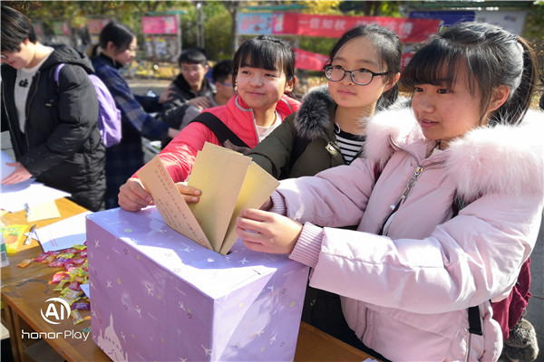 一纸书信表初心,不负韶华一路行。伴着秋日暖阳,过往的同学们纷纷驻足,执起手中的笔用心写下了送个一年后自己的一封信。一位男生在空白的纸页上写下了对未来的期许,“这个活动很有意义,让我重新定义未来,让现在的我不迷茫,希望一年后的自己能够实现今天写下的目标。”熊本熊则向周围的同学发起号召,现场气氛一度达到高潮。同学们趴在书桌上,缕缕阳光倾洒,一位女生将写好的信装到信封,投到信箱中,说道:“写一封信送给一年后的自己,我觉得非常浪漫,为平时沉重的学习生活带来了一抹文学的色彩,陶冶情操。”薄薄纸页传递深情,一场未来之约就此开始。