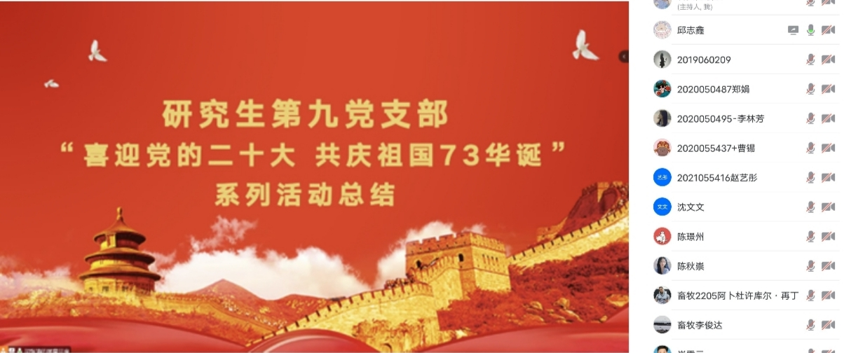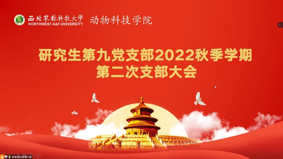 为喜迎党的二十大,庆祝新中国成立73周年,10月6日,av在线 研究生第九党支部召开以“喜迎党的二十大∙共庆祖国73华诞”为主题的秋季学期第二次支部大会,支部共计50余名成员参会,会议由支部书记胡张涛主持。