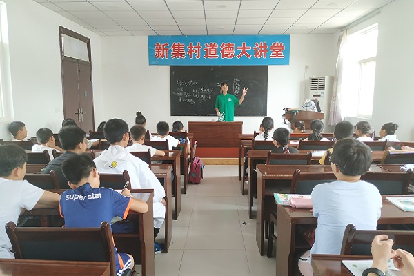 清晨,队员们一如往常乘车来到新集村大队,与前两天不同的是,推门而入,映入眼帘的是一张张漾进心田的笑脸,从小学到初中各年龄段不等的孩子们,早早就等在教室里,这是新集村支教小队的第一堂课。