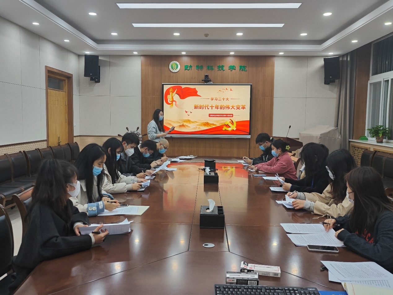 为深刻领会党的二十大报告的思想精髓、核心要义、战略部署,研究生第十党支部全体党员在自主学习的基础上,于11月24日在av在线 104会议室进行了集中研讨学习。
