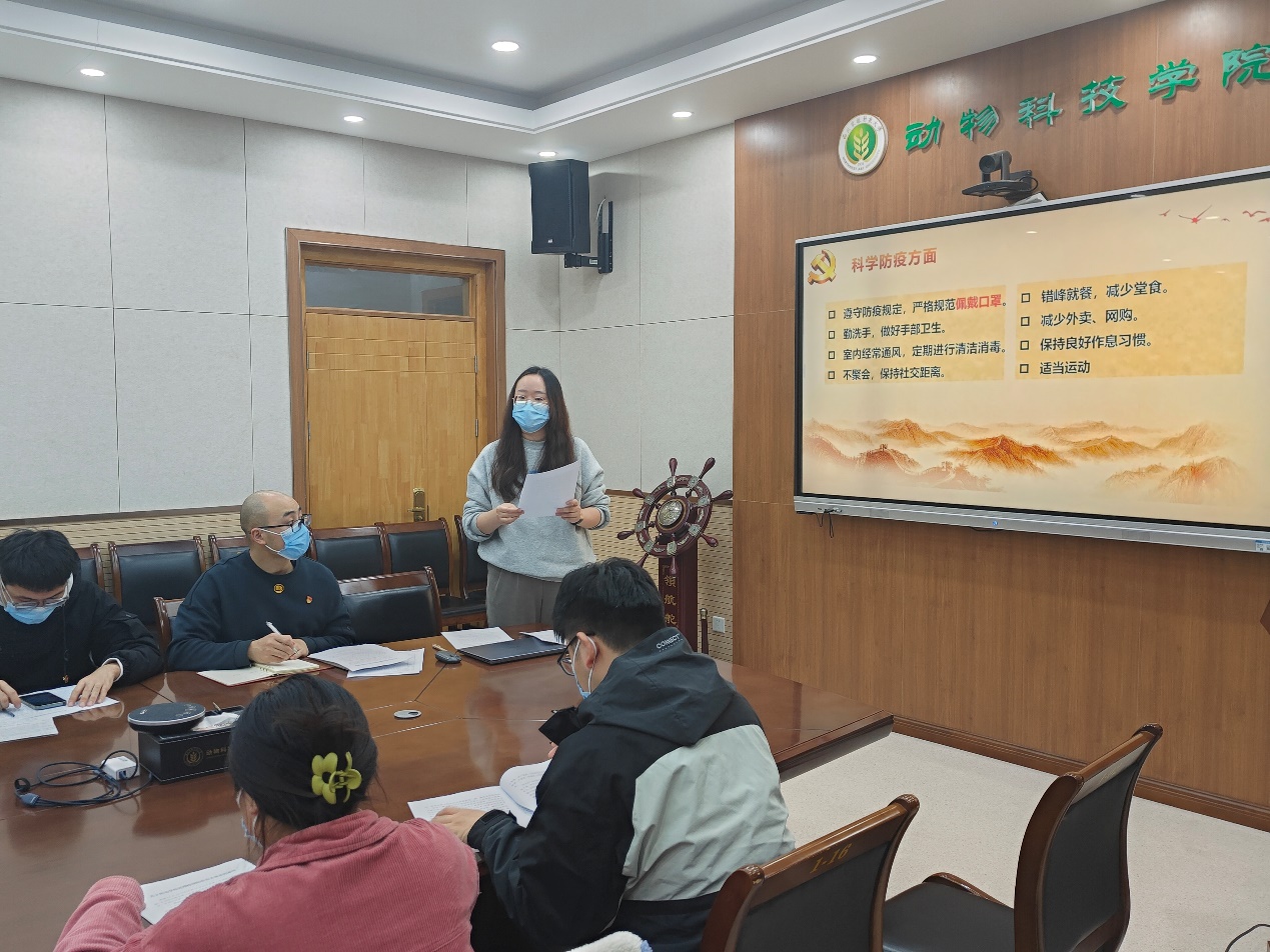中国共产党在成立之初,始终具有敢为人先的责任和担当。作为青年学生党员,我们更有传承红色基因,赓续精神血脉的使命。当前新型冠状病毒性肺炎疫情反复,面对全国疫情最复杂、省内疫情最严峻、示范区疫情最关键、学校疫情防控最吃紧的关键时期,支部书记洪婷婷同志号召党员发挥先锋模范作用,做疫情防控工作的宣讲员、示范者、贴心人,为抗击疫情贡献力量。带头积极配合学校的核酸检测安排和疫情期间门禁管理规定,做到非必要不离杨,确需离开杨凌的,严格履行请销假手续;在校学生非必要不出校,确需出校的,严格履行请假手续;特别是在校外居住的同学务必做到“家庭-学校”两点一线活动。对于疫情导致心理或者情绪上异常的同学,要留心注意,正确疏导,及时上报。