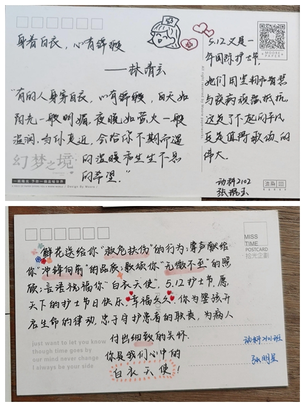 1854年至1856年间,英国的一位护士主任南丁格尔在英法联军与沙俄发生激战时带领护士参加护理伤病员的工作。当她看到当时医疗管理体系混乱,护理质量很差的情况是,她毅然下定决心潜心改善病室的卫生条件,以此拯救更多人的生命,为科学护理事业的产生与发展做出了巨大的贡献,被誉为“世界上第一个真正的护士”。为了纪念她对护理事业所作出的巨大贡献,国际护士理事会于1912年将其生日5月12日定为“国际护士节”。自疫情爆发以来,广大护士响应中国共产党的号召,白衣执甲,逆行出征,英勇无畏地投入到疫情防控的第一线。她们扛着巨大的心理压力,时刻面临着严峻考验,为打赢新冠疫情防控阻击战做出了巨大的贡献,是新时代征程上“最可爱的人”。我校校医院的医护人员作为守卫我校莘莘学子生命健康的最后一道防线,不仅在同学们生病时提供无微不至的照顾,而且在疫情爆发后,她们也毅然地站到抗击疫情的最前线,守卫着学校的安全。作为新时代的青年学子,又怎能忽视她们的默默付出呢?在活动开始后,同学们纷纷以录制视频、绘制明信片等形式表达自己的心意。在当天下午,实践部工作人员在不影响校医院的护士正常工作的情况下,将同学们亲手制作的感恩明信片赠送给校医院护士,以此表达对她们由衷的钦佩与深深的感恩之情。