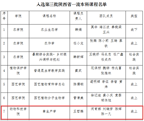 近日,陕西省教育厅公布了第三批省级一流本科课程认定名单,av在线王哲鹏副教授教学团队建设的《禽生产学》课程入选。