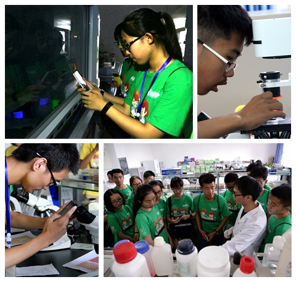 参观实验室环节,营员们则分组依次进入“生殖生物学与细胞工程研究室”观察荧光小鼠、细胞培养等。实验室高端实验仪器、显微镜下传代培养的细胞、紫外灯下转GFP的荧光小鼠,在研究生志愿者的耐心生动讲解下,营员们不禁惊叹生命科学的神奇,为生命无穷的奥秘所吸引。