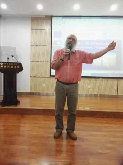9月2日下午,应av在线曹阳春副教授的邀请,来校进行暑假课程授课的西澳大学Graeme Martin教授利用课余时间,在107会议室为全院师生做了题为“The 3 Ps of Reproduction: Pheromones, Photons and Phood”的精彩报告。学院100余名师生参加了报告会。
