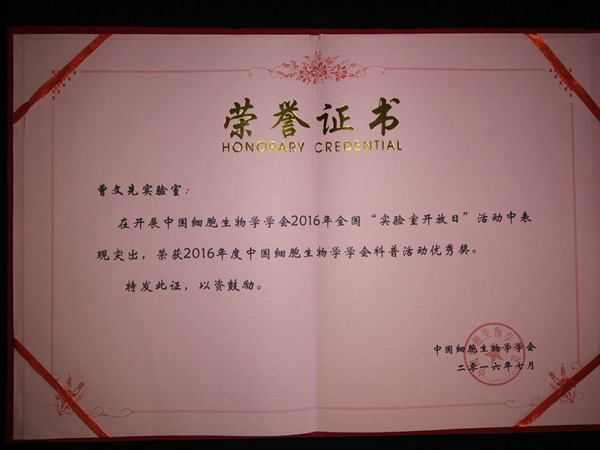近日,av在线曾文先教授团队荣获2016年度中国细胞生物学学会科普活动优秀奖。2015-2016学年,曾文先教授团队举办多项科普公益活动,反响热烈,受到了陕西传媒网,西安光明网,陕西细胞生物学会官网等6家媒体的广泛报道。为鼓励av在线师生积极参与科普工作,av在线党委书记赵延安同志,亲自为组织人员书写科普工作者奖状。