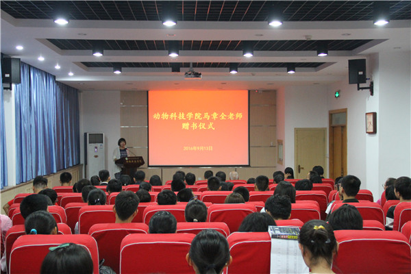 在赠书仪式上,马章全老师亲手向学生代表送上精编的《励志成才箴言集锦》,对党委宣传部及学院的支持表示感谢,并对编书的心路历程及内容进行了介绍。《集锦》收集了古代先贤、近代科学家、身边的教授及成功的企业家等经典感悟,分为“理想信念、珍惜时光、勤学笃行和励志奋进”的四部分内容。经过认真打磨,核对删改10次,整编成册以激励年轻一代成长成才,不负春光。马老师结合自己的学习、工作经历,强调同学们一定要树立正确的理想信念,为国家和人民作出贡献;鼓励学生不忘初心,抓紧时间,明确奋斗目标;作为动科学生,更要关注“三农”问题,要坚信在畜牧行业的大有可为、大有作为,珍惜青春时光,有理想、有坚持、有责任、踏实奉献,为国家发展奋勇前行。