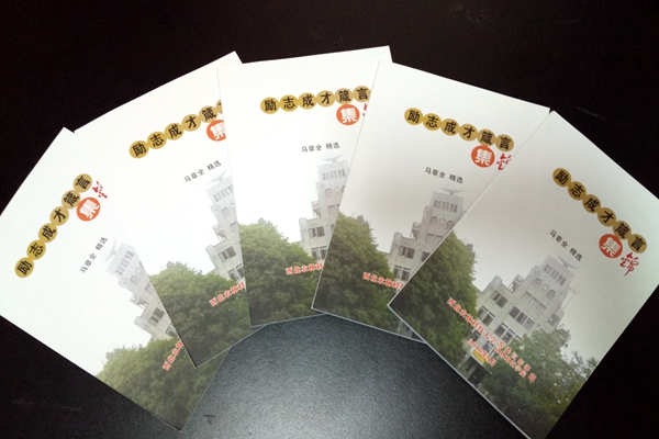马章全教授经常把自己读到的励志名言警句摘抄在笔记本上,日复一日,年复一年,已经抄满了二十余本。一次有人建议他,何不将自己的智慧结晶和人分享呢?马教授时任我校关心下一代委员会成员,于是就决定优先摘出励志成才的内容,分享给在校大学生。于是一本《励志成才箴言集锦》就诞生了。