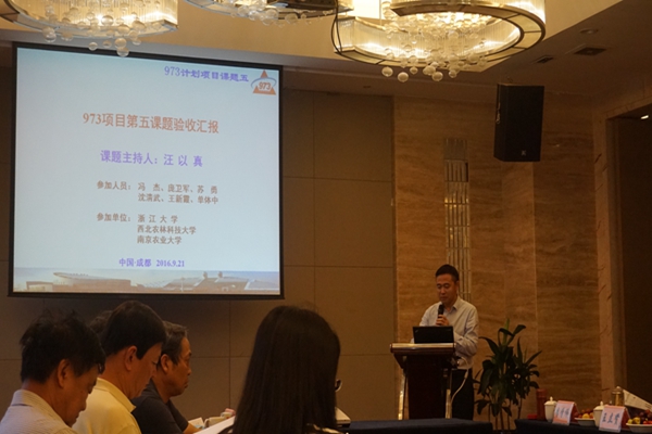 9月21-22日,973项目“猪肌纤维发育和肌内脂肪沉积的机制与营养调控”课题结题验收会议在四川成都召开。教育部科技司基础处主任邵海涛、中国农业大学科研院处长高铭宇、农业部饲料工业中心副主任牛爽和四川农业大学校长郑有良出席会议并致辞。973项目咨询组专家av在线杨公社教授、课题研究骨干庞卫军教授及团队成员于太永、褚瑰燕、李晓和蔡瑞博士参加了会议。此次会议由四川农业大学动物营养研究所承办,来自中国农业大学、浙江大学、av在线 、华中农业大学、南京农业大学、四川农业大学、中国科学院亚热带农业生态研究所和中国农业科学院畜牧兽医研究所等10余所高校和科研院所的50多名专家、学者参加会议。会议由中国工程院李德发院士主持。