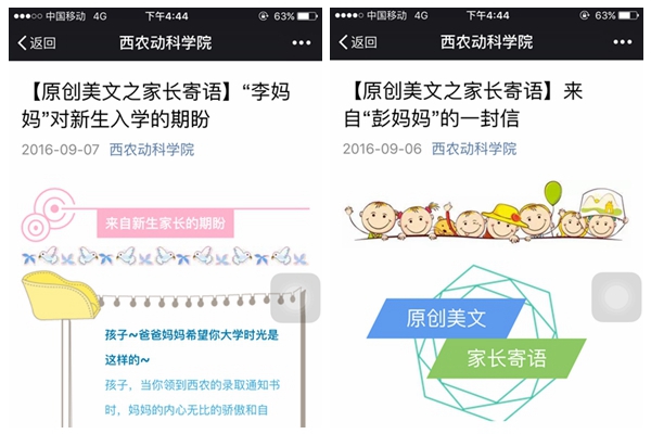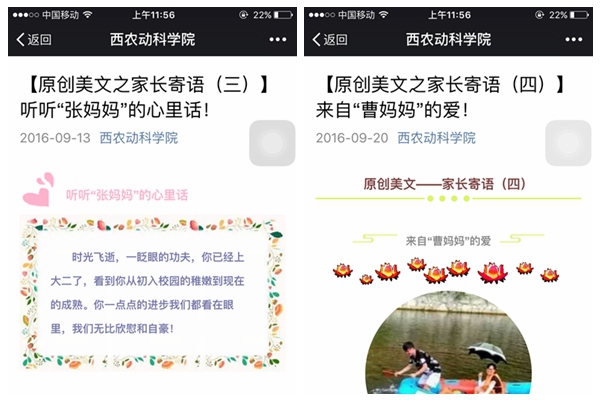 家庭是孩子的第一所学校,父母是孩子的第一任老师。动科学院官方微信平台推出“原创美文之家长寄语”系列推送,家长以书信、散文、诗词等形式,纷纷寄语学生,从回忆录到殷切期盼,真情流露,深情交流,为学生打造“幸福课堂”。家长参与度较高,2016级新生家长以对孩子的期望为主;2015级家长回顾孩子在校学习生活的一学年,提出感想,表达对学校的感谢;高年级学生家长以孩子未来的就业规划为题,希望孩子能合理择业,树立正确的就业观;2013级正在复习考研的学生家长以真情表达对孩子的美好祝愿。