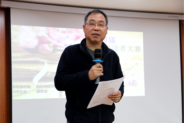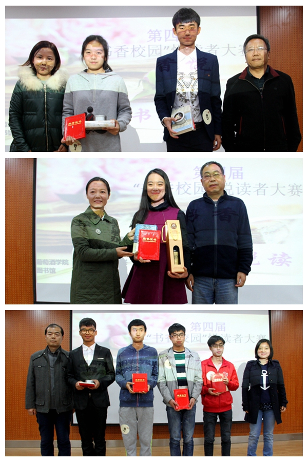 自10月18日起,“书香校园”悦读者大赛陆续开展“书香满月”、“名家讲座”、“美酒遇上书”、“书海千帆”等活动,历时一个月的“书香校园”悦读者大赛决赛在食品楼六楼报告厅举办。马克思主义学院教授方建斌、马克思主义学院副教授胡尊让、图书馆党总支副书记赵运良老师、人文学院刘娟老师、就业指导中心副主任白金凤老师、学生处副处长马宁老师、校团委副书记师燕妮老师以及葡萄酒学院党委副书记邓亚丽老师应邀出席并担任本次决赛评委。经初赛、复赛共10名学生进入决赛,av在线草业162班薛志鹏荣获二等奖,动科152班蔡魌健荣获三等奖,草业162班孙鹏越获得优秀奖。