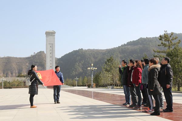 在高大肃穆的马栏革命纪念碑前,院党委副书记王晓娟带领大家面对鲜红的党旗,庄重地举起右拳,重温了入党誓词。