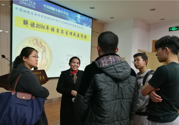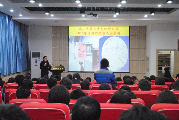 潘传英副教授以幽默风趣的语言,向大家详细讲述了诺贝尔奖的由来,结合细胞生物学书上的知识着重向同学们介绍了2016诺贝尔生理学或医学奖获得者大隅良典及其研究成果,并通过漫画的形式,生动形象地向听众科普了细胞自噬的作用机制,其中,漫画中的“美女小欠”让大家对细胞自噬的机制有了深刻的理解。同时,潘老师以幽默的语言向大家介绍了搞笑诺贝尔奖,如医学奖:身体左侧痒对着镜子右侧挠可以止痒,文学奖:用三卷自传体巨著介绍了其在收集死苍蝇或者快死的苍蝇时体会的乐趣等。最后,潘老师向大家介绍了杨振宁、李政道等多位华裔诺奖获得者,激励同学们积极投入到科研工作中来。现场气氛轻松活跃,同学们也将最热烈的掌声送给了潘老师。讲座结束后,参会同学纷纷表示受益匪浅。