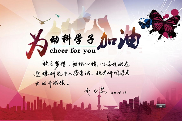 学院党委书记赵延安亲笔书写下对考研学子的深深祝福和殷切期望:“放飞梦想,放松心情,以最佳状态迎接研究生入学考试,祝考研同学考出优异成绩”。草业131班班主任王小龙寄语广大考研学子:“考研是青春征途上的一次历练,也仅是人生中的一个小站。行百里者半九十,希望同学们以长远之志、平常之心轻松应对”。水产131班班主任李方龙表示:“在这最后的几天时间里,希望同学们坚定信心、咬紧牙关,抱着“青霄有路终须到,金榜无名誓不归”的决心迎接考试。相信雨后初晴的阳光,必定属于你们每一个人”。动科136班班主任孙秀柱送给同学们自己最喜欢的一段话以表鼓励:忆如昨日,迷惘西来,怀着一颗懵懂的少年心,怯怯的来到了这里,而如今,意气风发,挥斥苍穹,谈笑间铺就前行之路。今天,是你昨天奋斗的结果,而明天要靠今天的努力。仍有梦想,还未实现;尚有远方,未曾抵达。