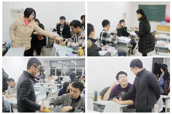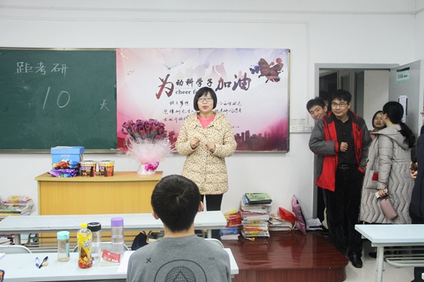 “考研倒计时10天”,几个大字赫然写在8号楼考研自习室的黑板上,2017届毕业生考研已经进入最后冲刺阶段。为进一步帮助考研学子调整心态、树立信心、坚持不懈、攻克难关,取得优异成绩。动科学院党委书记赵延安寄语广大考研学子,党委副书记王晓娟、毕业班班主任和全体专兼职辅导员走进考研自习室,为考研学子送上冬日的温暖与学院深深的祝愿。