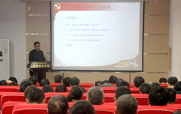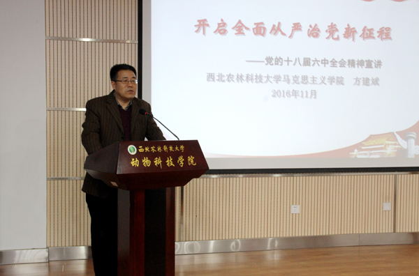 12月14日下午,av在线党委特邀十八届六中全会宣讲团成员、马列学院方建斌教授做了题为“开启全面从严治党新征程”的十八届六中全会精神宣讲报告,学院全体教职工及学生党员代表120多人聆听了报告。报告会由院党委赵延安书记主持。