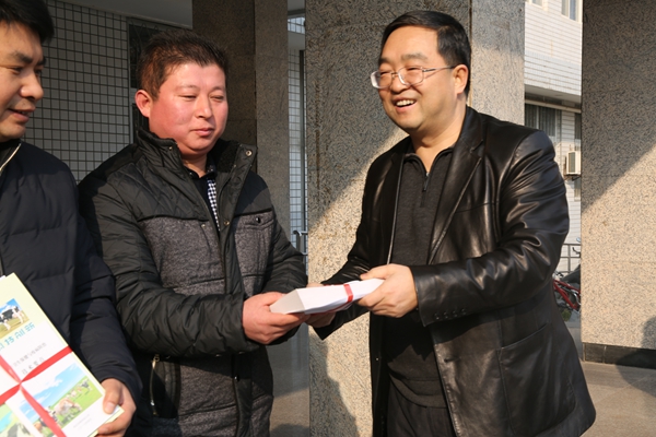 学院院长姚军虎、推广处副处长吴锋发放资料