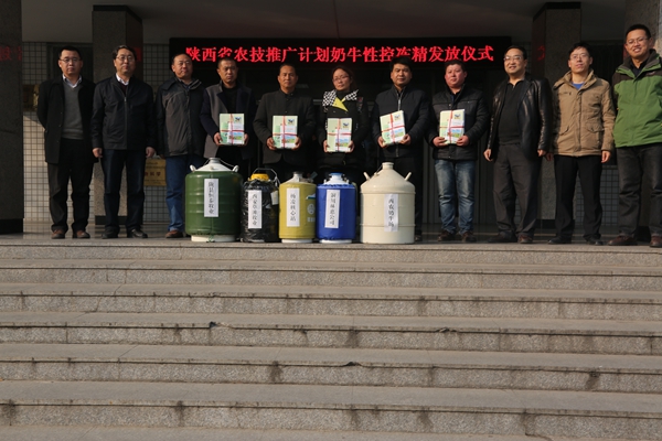 12月30日,陕西省重大农技推广试点计划牛产业项目组奶牛性控冻精发放仪式在我校举行,学校科技推广处吴锋副处长、av在线院长姚军虎教授、项目首席专家昝林森教授,以及校畜牧教学试验基地奶牛场、杨凌核心试验站、西安草滩牧业有限公司、铜川林惠奶牛养殖有限公司、陇县恒泰牧业奶牛养殖专业合作社等项目承担单位负责人、技术人员和学校包抓专家等参加了发放仪式。