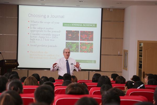 24日下午,在107会议室,James Sartin博士作了题为“Surviving the review process: an editor's perspective”的报告。学院部分教师及研究生120多人聆听了报告。James Sartin博士首先介绍了如何正确选取论文应该投的杂志。接着他从主编的角度讲述了论文写作各个部分的要点及可能导致拒稿的常见错误,同时强调了投稿时的注意事项及如何正确与审稿人进行交流。最后介绍了《Journal of Animal Science》杂志的基本情况。